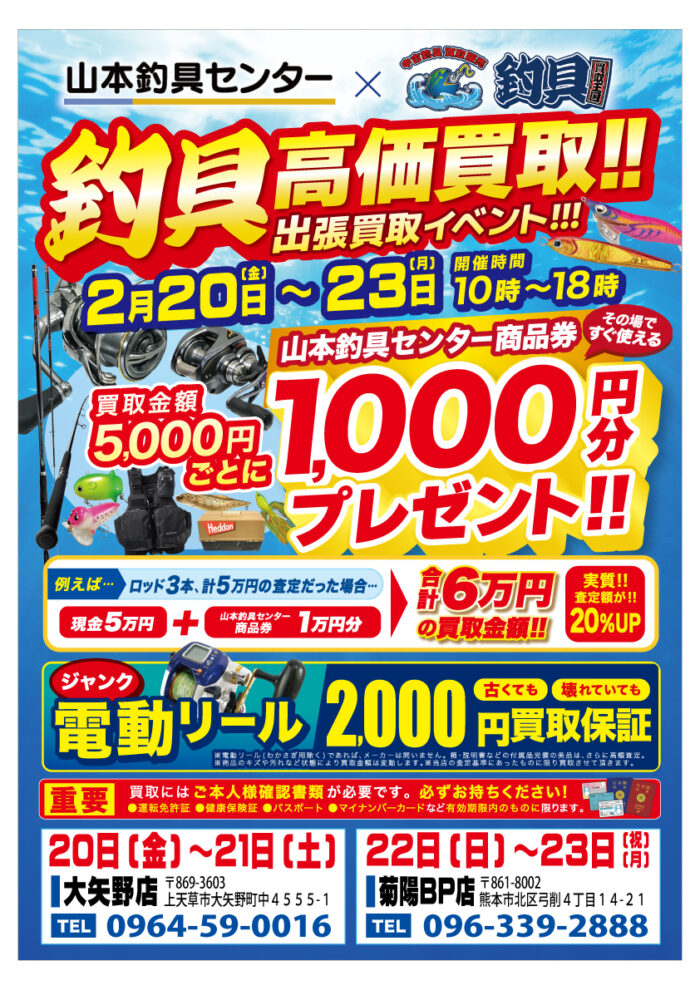 コラボ特典として、買取金額5,000円毎にその場ですぐ使える「山本釣具センター商品券」を1,000円分プレゼント!