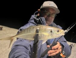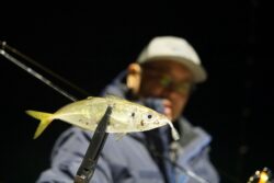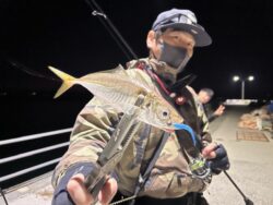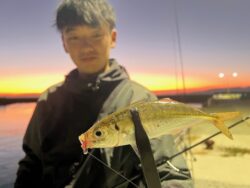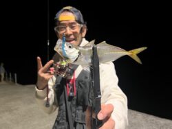 そうこうしていると、、、夕マズメにチーム内で若手NO.1のアジングの名手・板井君が