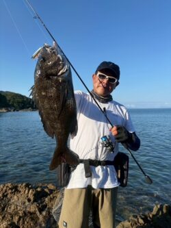 しばらくしてヒットするも、魚に走られ瀬にラインを巻かれて苦戦するも、“秘技オープンベール”で何とかキャッチしたのは、45cmほどの真っ黒なチヌ♪