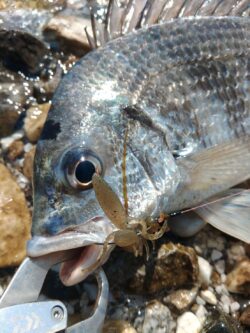 低水温期の気難しいチヌにも口を使わせる「程よいアピール力」と澄み潮時の必殺カラー「サンドシュリンプ」の組み合わせ